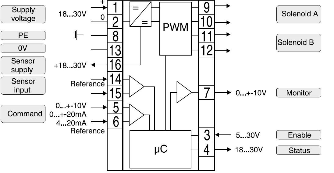 Elektronický digitální modul pro řízení proporcionálních ventilů se snímáním polohy šoupátka nebo ventilů v systémech s uzavřenou vnější regulační smyčkou, montáž na lištu EN 50022, komunikační rozhraní RS-232C